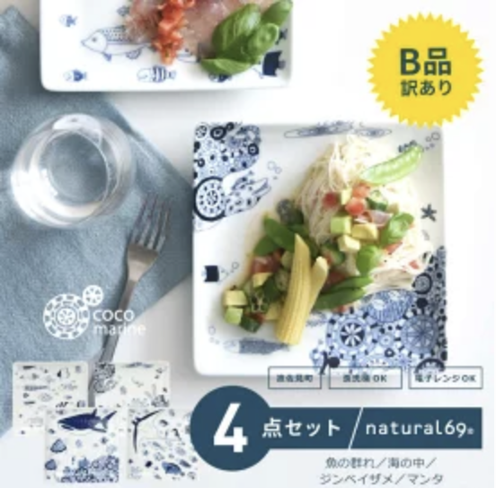 商品名【 訳あり 】 【 波佐見焼 】 cocomarine 正角皿 4柄セット ( 魚の群れ / 海の中 / ジンベイザメ / マンタ )